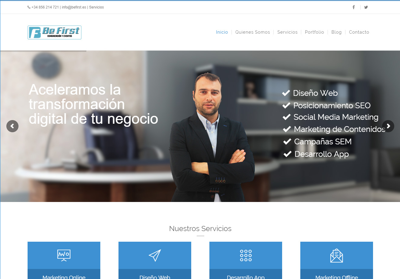 Desarrollo de la web con WordPress. Instalación, configuración y personalización de la plantilla Yamato. Integración de todos los contenidos en dos idiomas utilizando el plugin WMPL. Trabajo SEO realizado por el equipo de Be First.